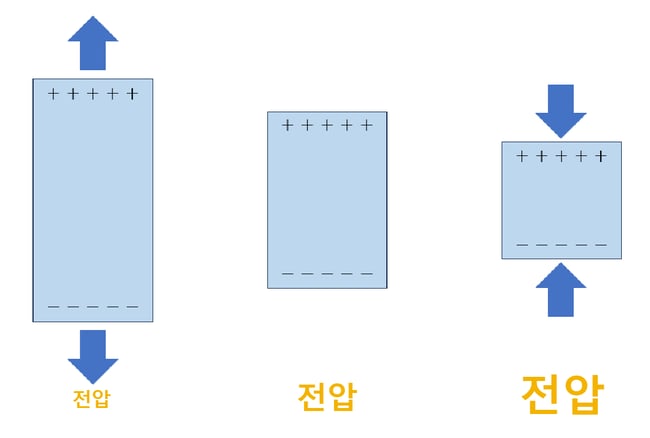 압전 소자는 압축하는 힘을 받으면 출력 전압이 커지고, 잡아당기는 힘을 받으면 출력 전압이 작아집니다.