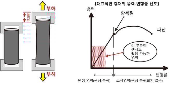 그래프를 보면 탄성 영역에서는 부하에 따라 신장이 비례 관계로 되어 있는 것을 알 수 있습니다. 이 부분이 하중 센서로 사용할 수 있는 영역입니다.