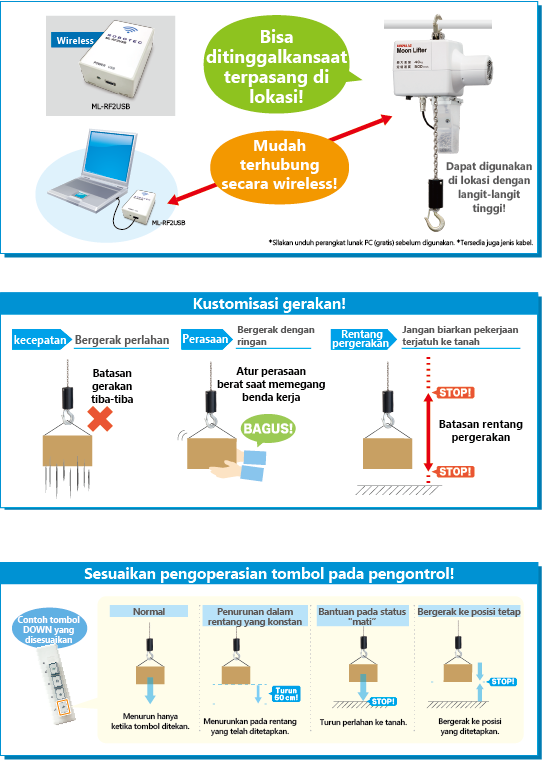 Moon Lifter juga dapat mengangkat dan menurunkan workpiece dengan menekan tombol pada pengontrol, namun dalam proses tersebut, ia secara konstan mendeteksi gaya dan tidak menghasilkan gaya di atas beban yang ditentukan, sehingga memastikan keamanan.