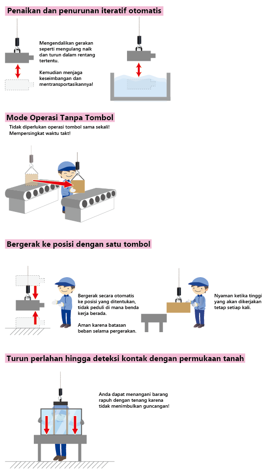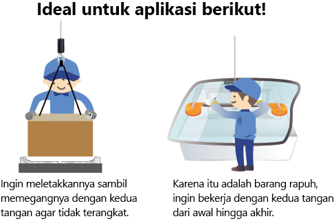Ini dapat secara otomatis mendeteksi berat workpiece pada saat diangkat dan menyesuaikan jumlah bantuan. Tidak diperlukan operasi tombol, dan kecepatan pergerakan dapat disesuaikan dengan jumlah gaya yang diterapkan pada workpiece yang dipegang dengan kedua tangan, sehingga mudah digunakan oleh siapa pun.