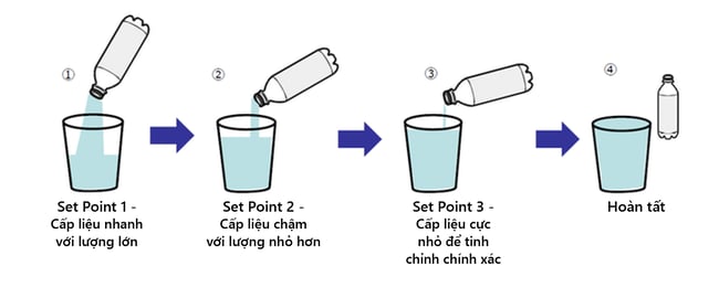 Điểm đặt 1, 2 và 3 (SP1, SP2, SP3) là các chức năng cho phép máy chiết rót hoặc thiết bị tương tự thay đổi phương thức cấp liệu tùy theo tỷ lệ so với trọng lượng mục tiêu trong quá trình chiết rót.