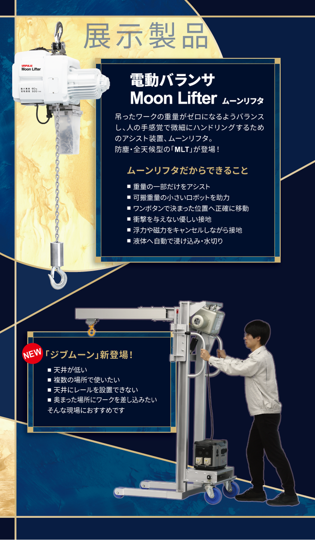 電動バランサ「ムーンリフタ」は、吊ったワークの重量がゼロになるようバランスし、軽い力で扱うことができる吊下げ型のパワーアシスト装置です。