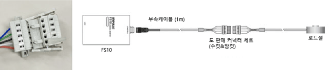 FS10는 본체, 로드셀 케이블 1 m(앞부분 낱개), USB 케이블 1.8 m(A-miniB 타입), 퀵 메뉴얼이 세트입니다.