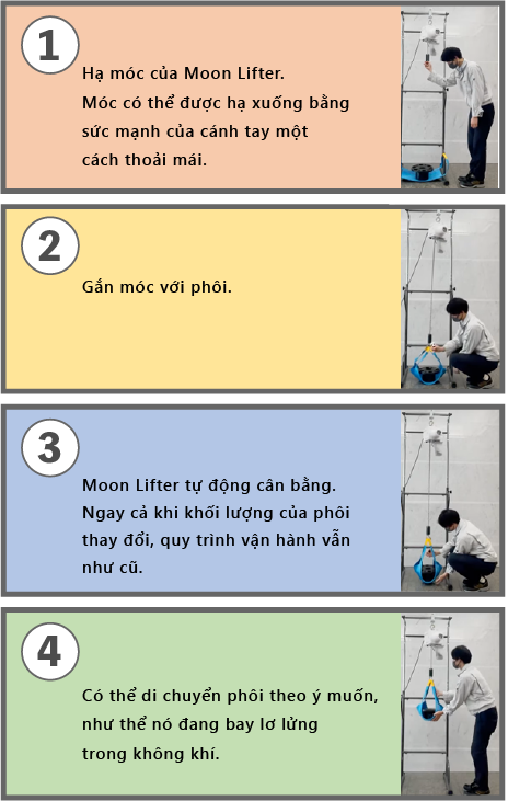 Moon lifter là một thiết bị bị hỗ trợ nâng hạ, cho phép nâng vật nặng bằng cả hai tai mà không cần dùng đến nút bấm để vận hành.