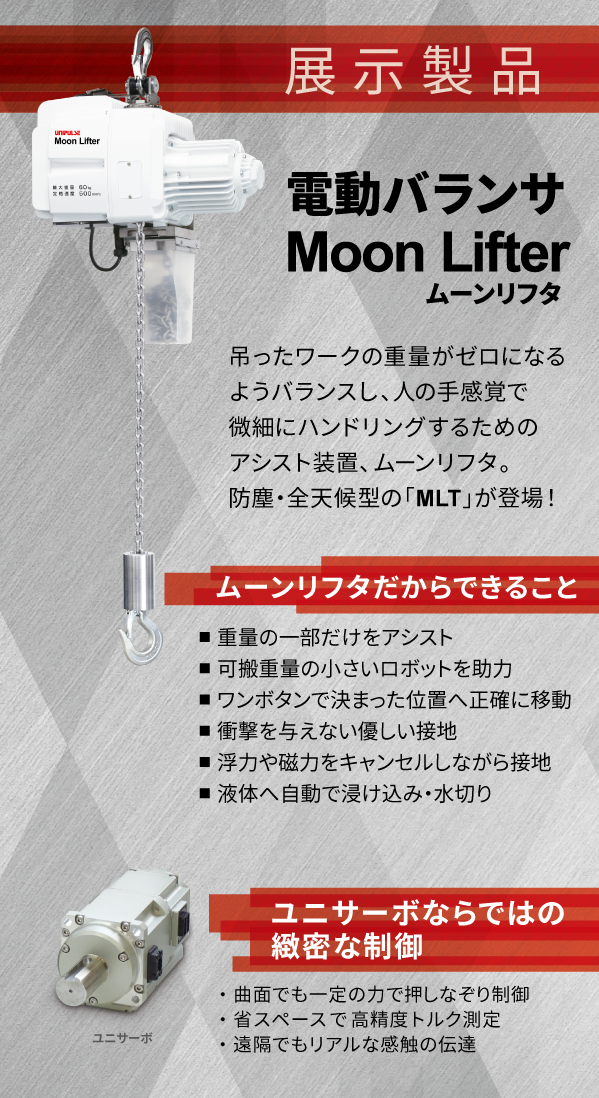 電動バランサ「ムーンリフタ」は、吊ったワークの重量がゼロになるようバランスし、軽い力で扱うことができる吊下げ型のパワーアシスト装置です。