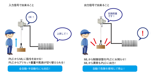 PLCやロボットと連動するために必要な入出力信号を4chずつご用意。外部入力では「上位からの動作指令」「プリセット重量や風袋の切り替え」、 外部出力では「制御状態をお知らせ」「異常をお知らせ」が行えます。