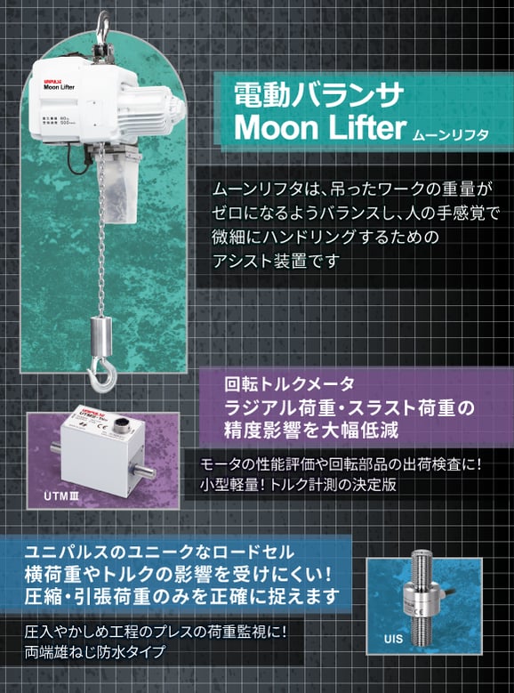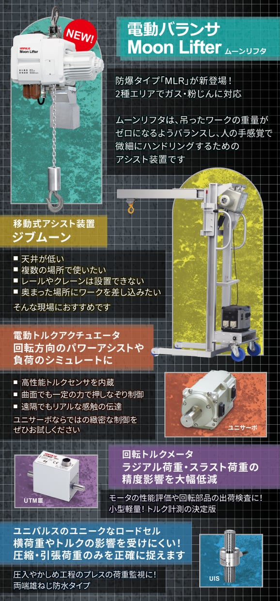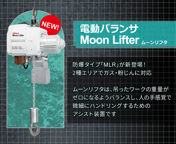 電動バランサ「ムーンリフタ」は、吊ったワークの重量がゼロになるようバランスし、軽い力で扱うことができる吊下げ型のパワーアシスト装置です。