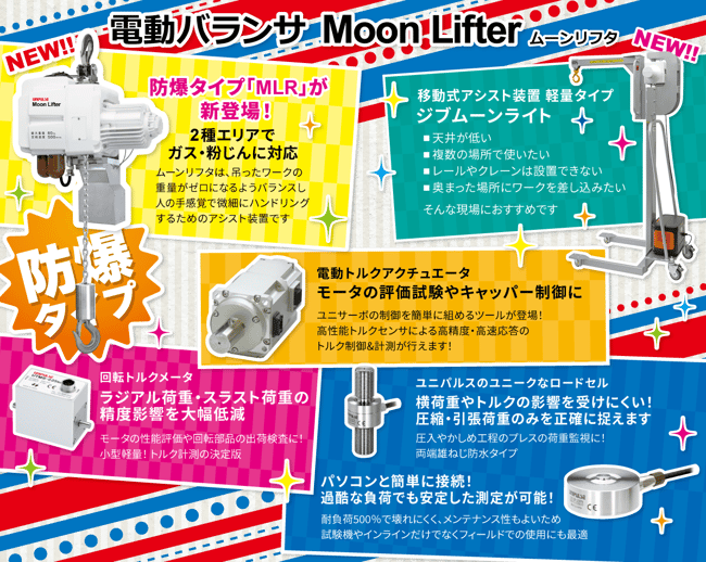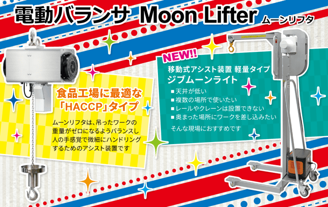 電動バランサ「ムーンリフタ」は、吊ったワークの重量がゼロになるようバランスし、軽い力で扱うことができる吊下げ型のパワーアシスト装置です。人だけではなくロボットのアシストも行えます。