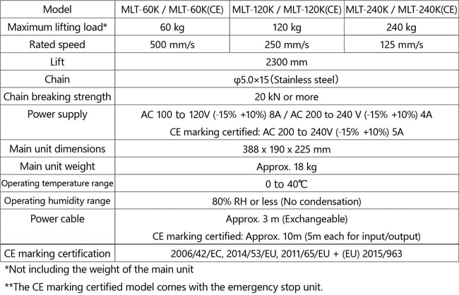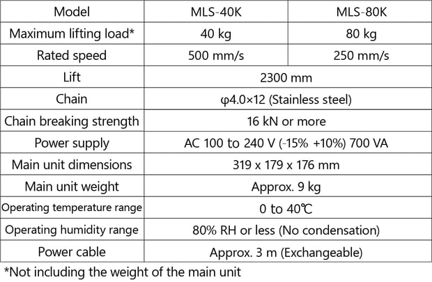 "New model MLS-80K" is recommended when the lifting load capacity is insufficient with 60kg, or a little more loading capacity is needed due to the weight of the lifting clamp. Meanwhile, "New MLS-40K" is recommended for the sites where dust-proof and drip-proof capabilities are required.