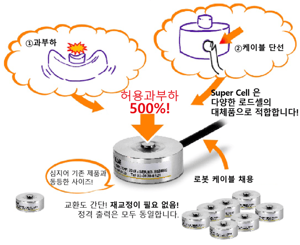 슈퍼셀은 기존 로드셀의 망가지는 원인을 찾아 깨지지 않고 깨지더라도 제조라인의 다운타임을 최소화한다는 발상으로 개발한 것입니다.