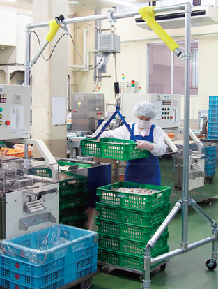 電動バランサ「ムーンリフタ」は、吊ったワークの重量がゼロになるようバランスし、軽い力で扱うことができる吊下げ型のパワーアシスト装置です。