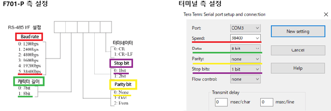 설정 항목은 「보레이트」, 「캐릭터 길이」, 「스톱 비트」, 「패리티 비트」의 4개입니다.