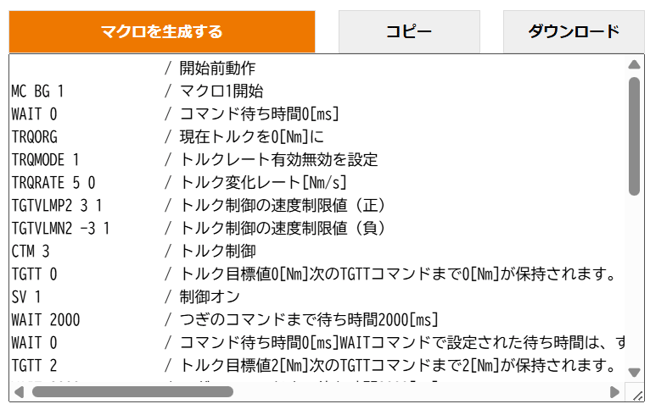 条件を選択するだけで、「モータ検査(T-N曲線)」、「キャッパーの締め付け検査」のマクロが自動生成できるツールです。例えば以下のようなマクロが簡単に組めます。